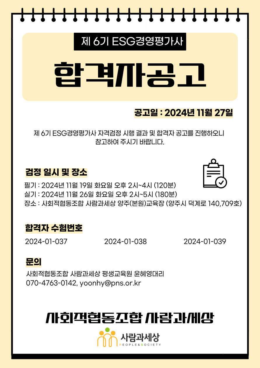 °øÁö °øÁö»çÇ× Á¦6±â ESG°æ¿µÆò°¡»ç ÇÕ°ÝÀÚ°ø°í pnscoop 2024-11-27