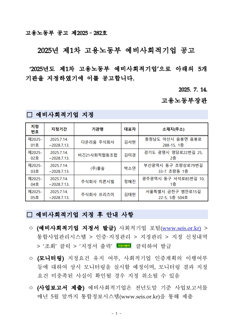 [SViz] (°í¿ë³ëµ¿ºÎ)2025³â Á¦1Â÷ °í¿ë³ëµ¿Çü ¿¹ºñ»çȸÀû±â¾÷ ÁöÁ¤ °á°ú °ø°í