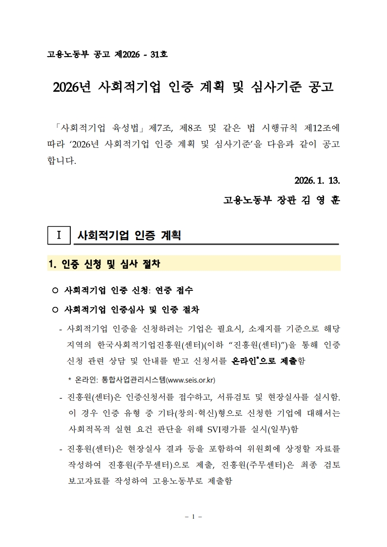 [SViz] [°í¿ë³ëµ¿ºÎ] 2026³â »çȸÀû±â¾÷ ÀÎÁõ °èȹ ¹× ½É»ç±âÁØ °ø°í