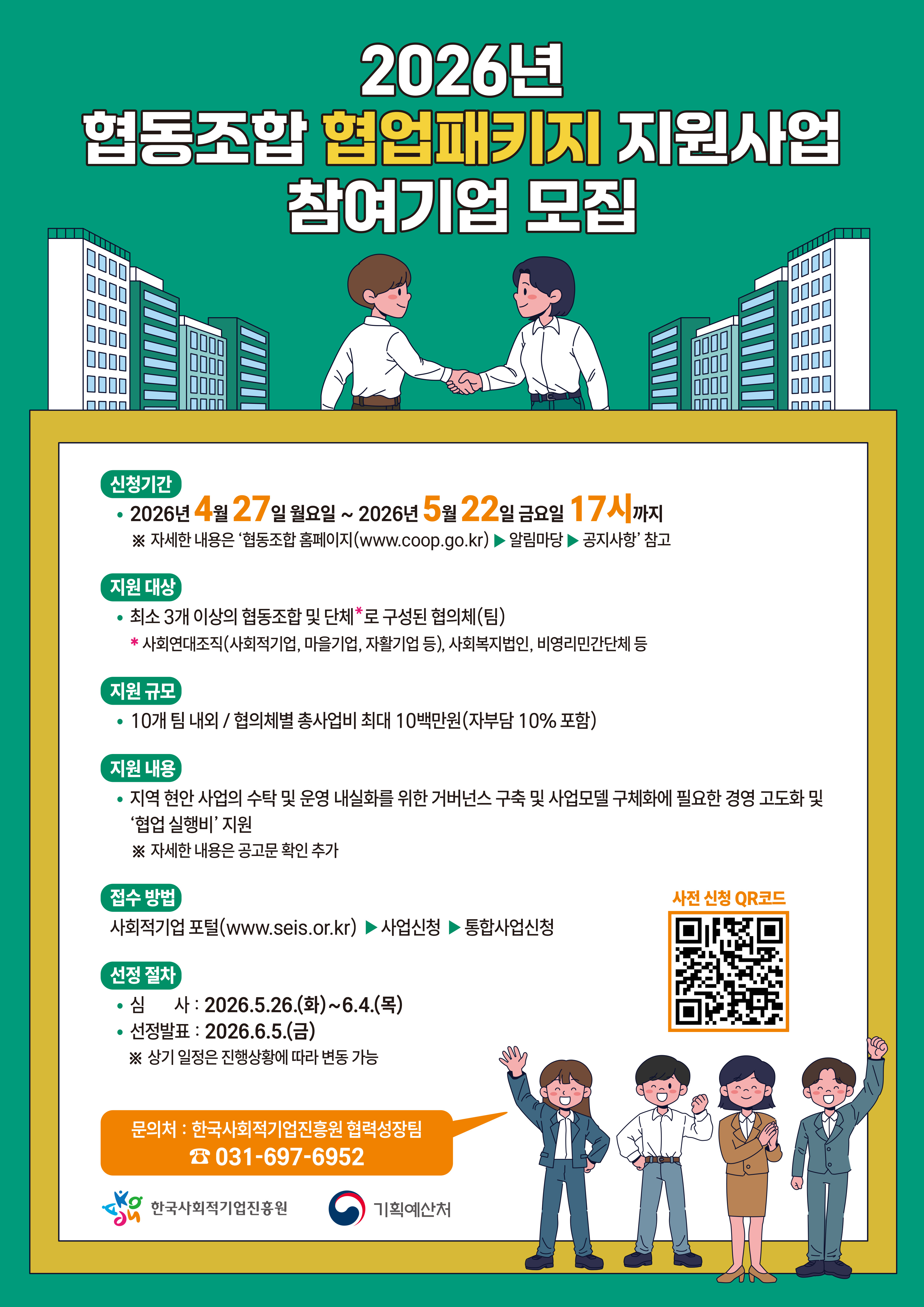 [¸ðÁý] 2026³â Çùµ¿Á¶ÇÕ ¸ðµ¨ ¹ß±¼ ¹× Çù¾÷È Áö¿ø»ç¾÷¡Ú°ø°í¹® ¹Ù·Î°¡±â 1. »ç¾÷ °³¿ä¡Û Á¢¼ö ±â°£: 2026. 4. 28.(È) ~ 5. 22.(±Ý) 17:00±îÁö¡Û Áö¿ø ´ë»ó: Çùµ¿Á¶ÇÕÀ» Æ÷ÇÔÇÏ¿© 3°³ ÀÌ»óÀÇ »çȸÀû°æÁ¦Á¶Á÷(»çȸÀû±â¾÷ µî) ¹× ºñ¿µ¸® ´Üü·Î ±¸¼ºµÈ ÇùÀÇü¡Û Áö¿ø ±Ô¸ð: ÃÑ 10°³ ÆÀ ³»¿Ü ¼±Á¤ ¹× ÆÀº° ÃÖ´ë 1,000¸¸ ¿ø Áö¿ø (Àںδã 10% Æ÷ÇÔ)¡Û ½Åû ¹æ¹ý: »çȸÀû±â¾÷ Æ÷ÅÐÀ» ÅëÇÑ ¿Â¶óÀÎ Á¢¼ö 2. ÁÖ¿ä Áö¿ø ³»¿ë¡Û °Å¹ö³Í½º ±¸Ãà Áö¿ø: Âü¿© ±â°ü °£ÀÇ Àü·« ¿öÅ©¼ó ¹× ³×Æ®¿öÅ· Ȱµ¿ µî Çù·Â ü°è ¼³°è Áö¿ø.¡Û »ç¾÷ ¸ðµ¨ ±¸Ã¼È: ÁöÀÚü µî ´Ù¾çÇÑ ÀÌÇØ°ü°èÀÚ¿Í ÀÇ°ß Á¶À² °úÁ¤ Áö¿øÀ» ÅëÇØ Çù·Â ¸ðµ¨ µµÃâ ¹× ½Ã¹ü ¿î¿µ Áö¿ø.
