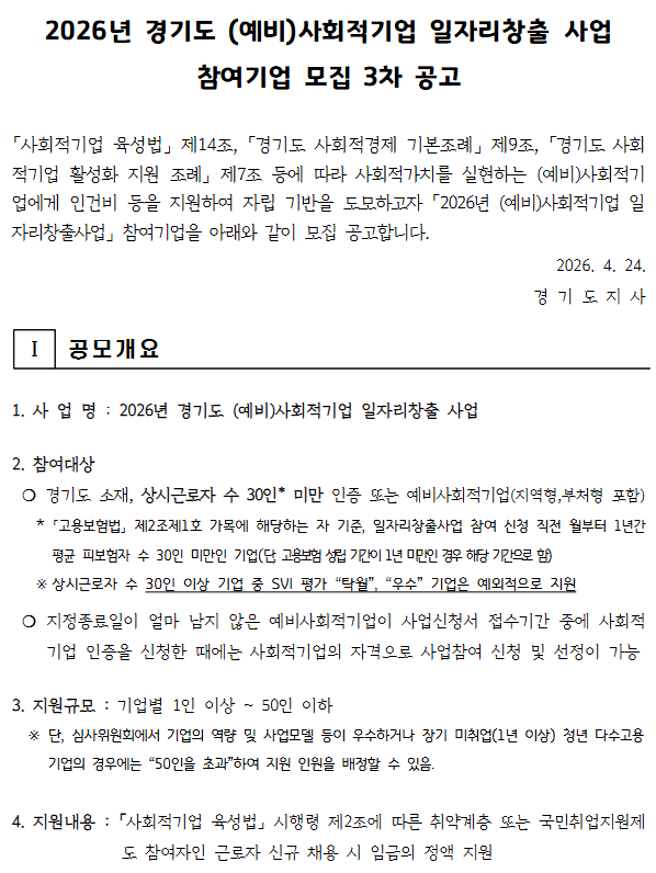 [¸ðÁý] 2026³â °æ±âµµ (¿¹ºñ)»çȸÀû±â¾÷ ÀÏÀÚ¸®Ã¢Ãâ »ç¾÷