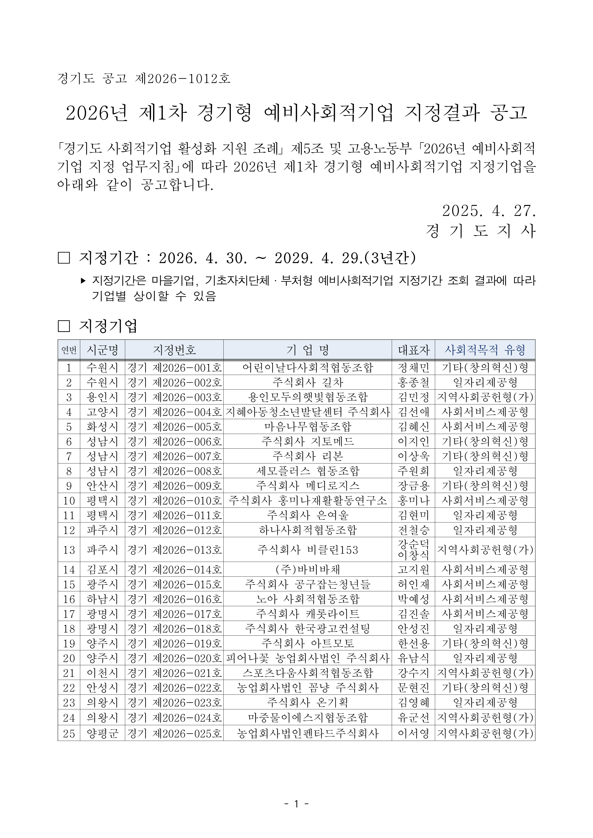 [°ø°í] 2026³â Á¦1Â÷ °æ±âÇü ¿¹ºñ»çȸÀû±â¾÷ ÁöÁ¤ °á°ú¡Ú°ø°í¹® ¹Ù·Î°¡±â2026³â Á¦1Â÷ °æ±âÇü ¿¹ºñ»çȸÀû±â¾÷À¸·Î »õ·Ó°Ô ÁöÁ¤µÈ ±â¾÷ ¸í´ÜÀ» ´ÙÀ½°ú °°ÀÌ °ø°íÇÕ´Ï´Ù.¡à ÁöÁ¤±â°£ : 2026. 4. 30. ~ 2029. 4. 29.(3³â°£)‣ ÁöÁ¤±â°£Àº ¸¶À»±â¾÷, ±âÃÊÀÚÄ¡´Üü¡¤ºÎóÇü ¿¹ºñ»çȸÀû±â¾÷ ÁöÁ¤±â°£ Á¶È¸ °á°ú¿¡ µû¶ó ±â¾÷º° »óÀÌÇÒ ¼ö ÀÖÀ½¡à ÁöÁ¤±â¾÷ : ÁöÁ¤±â¾÷Àº 25°³»ç·Î ¾Æ·¡¿Í °°½À´Ï´Ù.(Ãâó: °æ±âµµÃ»)